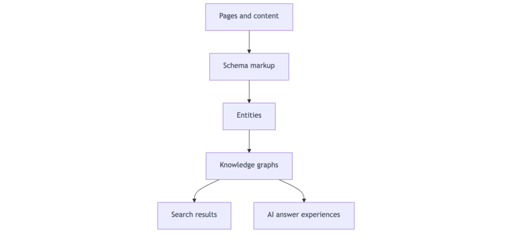 A helpful way to think about it: your content explains; schema translates; knowledge graphs connect.